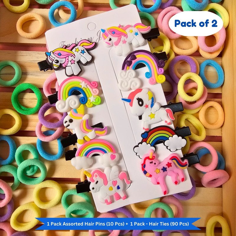 Pastel Mini Hair Ties with Unicorn Rainbow Flower hair Clip Set (Pack of 2, Multicolor)