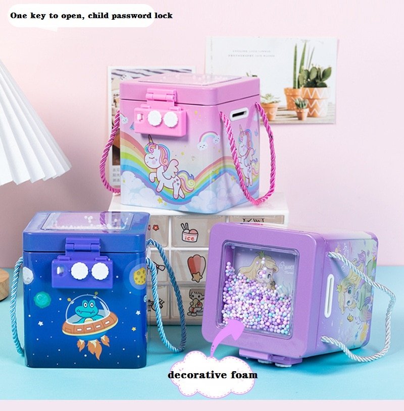 New Cute Unicorn Tinplate Hand Rope Square Password Lock Piggy Bank Children's Cartoon Mermaid Dino Savings Change Coins Money Box