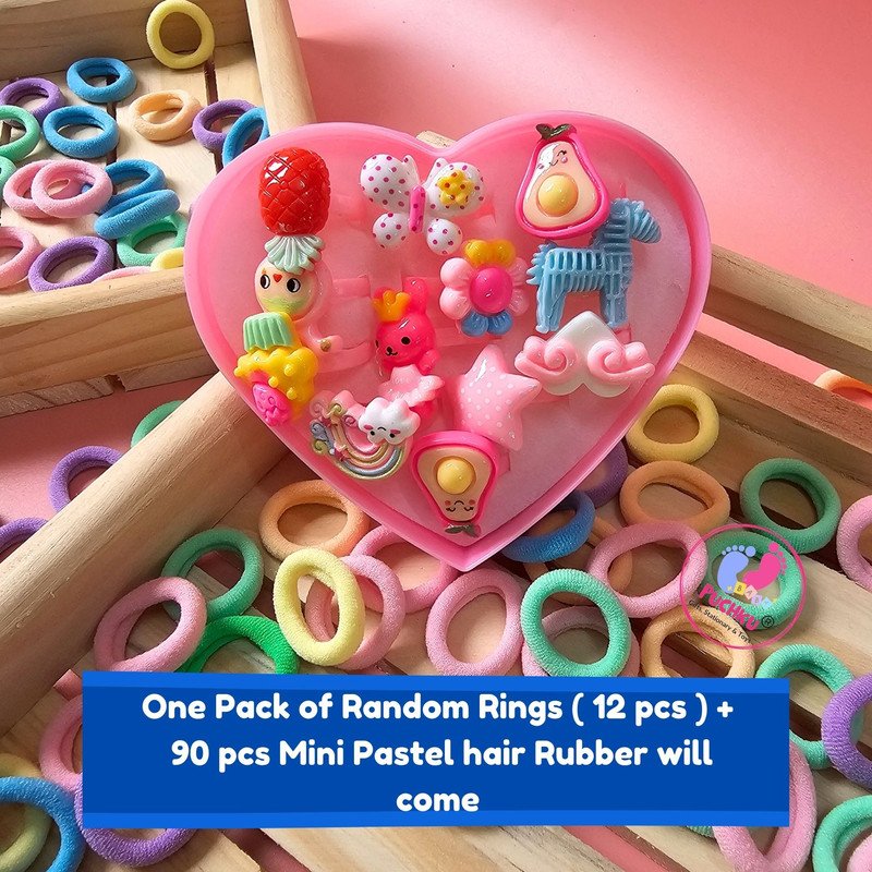"""Key Feature Best for Gifting & personal Use, combine it with a matching dress & be in the limelight of every Occasion skin-friendly & plating is non-allergic & safe for all environments. Colorful attractive colors mini elastic hair ties for girls for different hairstyles Good quality and vibrant colors. beautiful kids cartoon-shaped plastic play toy adjustable fancy rings for girls contain 12 pcs durable set made up of high quality plastic and crafted unique and attractive that will make your daughters mesmerized. Specification Brand - Bubble Trouble Type - Hair clips Age - 3 Years + Product Description This set includes 1 Pack of Pastel mini hair ties (90 Pcs in a Pack) + One Pack of Random Adjustable Rings ( 12 pcs ) The hair ties Pack contains 90 pcs of mini Ties. Trendy hair clips, freely match according to your favorite style. Ideal for toddlers, baby girls, little girls. Different styles different size, suitable for different hairstyles Smooth And Soft Which Do No Harm To Doll Hair And Skin Trendy and fashionable with a great grip. Secure hold all day. Available on almost all occasions needed, suitable for parties, outings, photos, vacations, and other occasions wear, make your babies bright and beautiful in the crowd. It is a perfect gift for children. Set of 12 Finger Ring For Kids Lovely Cartoon Animals Children Resin Plastic Ring They are packed in a cute pink heart-shaped box. Perfect for birthday goodie bags, pretend play and dress up rings, tea party, treasures box and more. Item Included in The Package 1 Pack of Pastel mini hair ties ( 90 Pcs of Mini Hair Ties in a Pack) + One Pack of Random Adjustable Rings ( 12 pcs ) Disclaimer: We have made a consistent effort to make the colors and finishes similar to the image of the products you see on the screen. However, the actual product and the images on the website can differ! The customer's discretion is advised. Note: The products in the image are for illustrational purposes. Please refer to ""items included in the package"" to understand what is inclusive of the price.""