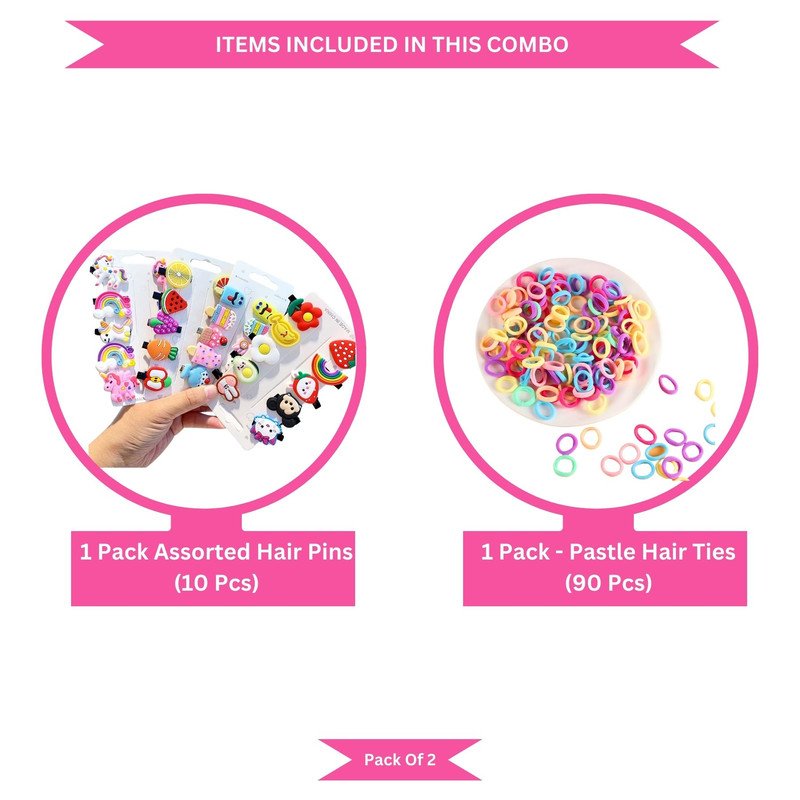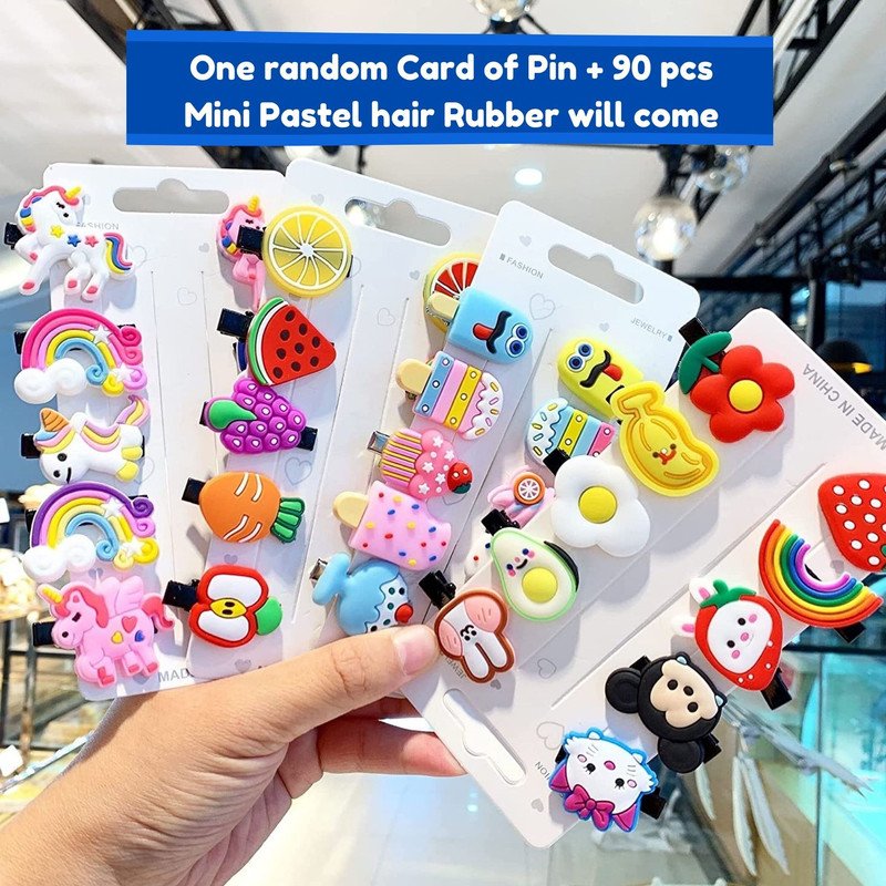 """Key Feature Best for Gifting & personal Use, combine it with a matching dress & be in the limelight of every Occasion skin-friendly & plating is non-allergic & safe for all environments. Colorful attractive colors mini elastic hair ties for girls for different hairstyles Good quality and vibrant colors. Trendy hair clips Specification Brand - Bubble Trouble Type - Hair clips Age - 3 Years + Product Description This set includes 1 Pack of Pastel mini hair ties + 1 Pack Hair Clip Set (Random Design) The hair ties Pack contains 90 pcs of mini Ties. Trendy hair clips, freely match according to your favorite style. Ideal for toddlers, baby girls, little girls. Different styles different size, suitable for different hairstyles Smooth And Soft Which Do No Harm To Doll Hair And Skin Trendy and fashionable with a great grip. Secure hold all day. Available on almost all occasions needed, suitable for parties, outings, photos, vacations, and other occasions wear, make your babies bright and beautiful in the crowd. It is a perfect gift for children. Item Included in The Package 1 Pack of Pastel mini hair ties ( 90 Pcs of Mini Hair Ties in a Pack) + 1 Pack Hair Clip Set (Random Design) Disclaimer: We have made a consistent effort to make the colors and finishes similar to the image of the products you see on the screen. However, the actual product and the images on the website can differ! The customer's discretion is advised. Note: The products in the image are for illustrational purposes. Please refer to ""items included in the package"" to understand what is inclusive of the price."""