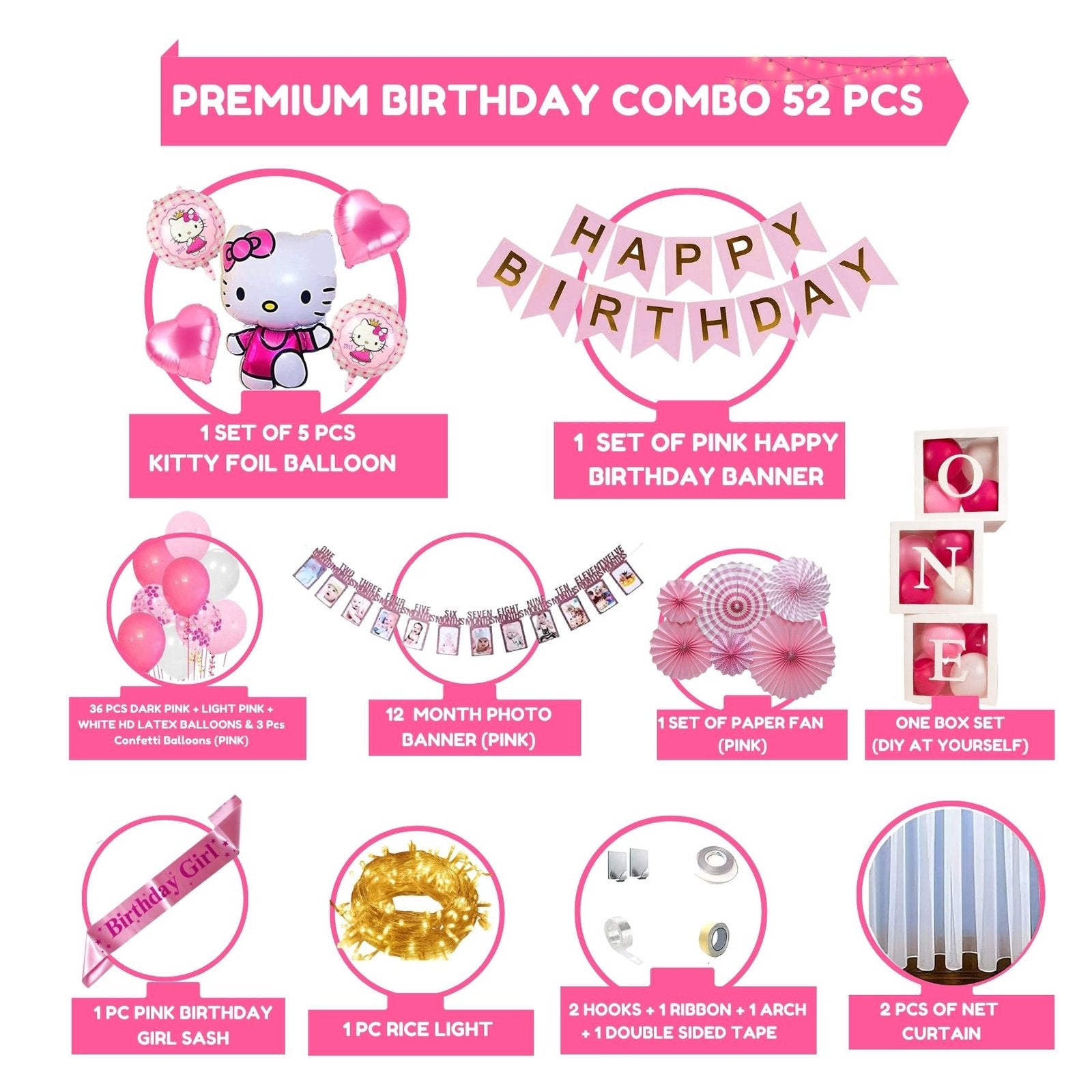 Premium Happy Birthday Combo KIT kitty foil Balloon Set with sash for first 1st birthday Theme girls kids ( pack of 52 , Multicolor)